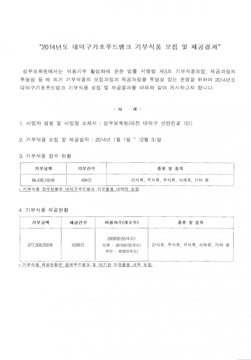 19-03-28 11:21 2014년 대덕구기초푸드뱅크 운영실적(기부식품 모집 및 제공결과) 페이지 정보 작성자 성우보육원 댓글 0건 조회 6,112회 본문 2014년 대덕구기초푸드뱅크 운영실적(기부식품 모집 및 제공결과) 을 게시합니다. 목록 댓글목록 댓글목록 등록된 댓글이 없습니다.