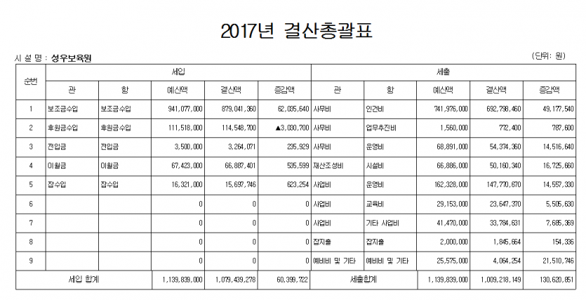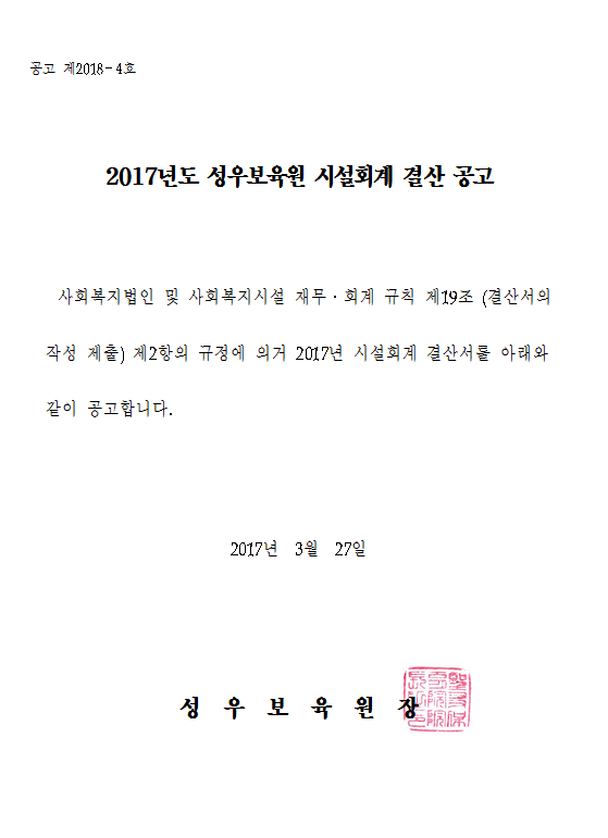 2017년도 성우보육원 시설회계 결산을 공고합니다.