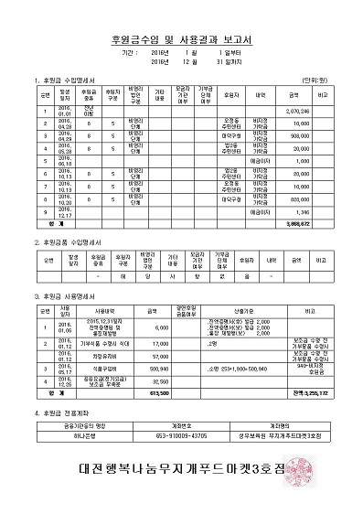 19-03-28 11:36 대전행복나눔무지개푸드마켓3호점 2016년 후원금 수입 및 사용결과 공고 페이지 정보 작성자 성우보육원 댓글 0건 조회 6,207회 본문 대전행복나눔무지개푸드마켓3호점 2016년 후원금 수입 및 사용결과 공고 목록 댓글목록 댓글목록 등록된 댓글이 없습니다.