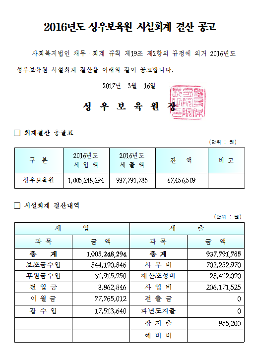 19-03-28 11:37 (공고)2016년 시설회계 결산 페이지 정보 작성자 성우보육원 댓글 0건 조회 6,261회 본문 2016년 시설회계 결산 목록 댓글목록 댓글목록 등록된 댓글이 없습니다.