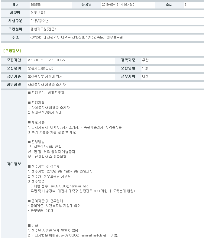 19-03-28 11:32 (채용공고)생활지도원 모집 페이지 정보 작성자 성우보육원 댓글 0건 조회 6,482회 본문 생활지도원 모집 목록 댓글목록 댓글목록 등록된 댓글이 없습니다.