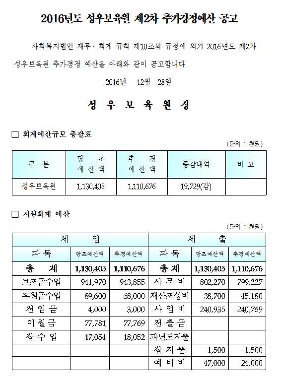19-03-28 11:33 2016년 제2차 추가경정 예산 공고 페이지 정보 작성자 성우보육원 댓글 0건 조회 6,571회 본문 2016년 제2차 추가경정 예산 공고 목록 댓글목록 댓글목록 등록된 댓글이 없습니다.