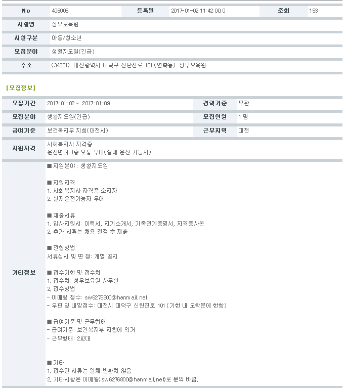 19-03-28 11:34 (공고) 생활지도원 모집 공고(긴급) 페이지 정보 작성자 성우보육원 댓글 0건 조회 6,195회 본문 (공고) 생활지도원 모집 공고(긴급) 목록 댓글목록 댓글목록 등록된 댓글이 없습니다.