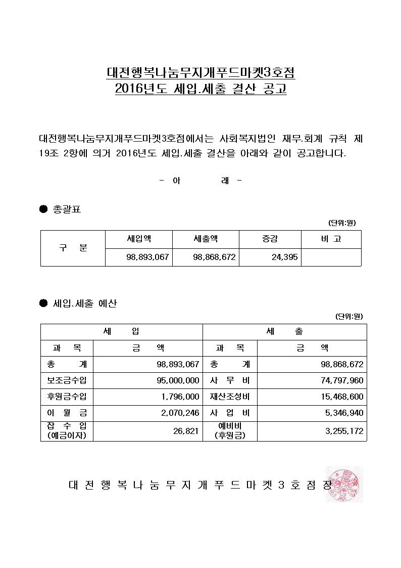 19-03-28 11:35 대전행복나눔무지개푸드마켓3호점 2016년 세입.세출 결산공고 페이지 정보 작성자 성우보육원 댓글 0건 조회 6,108회 본문 대전행복나눔무지개푸드마켓3호점 2016년 세입.세출 결산공고 목록 댓글목록 댓글목록 등록된 댓글이 없습니다.
