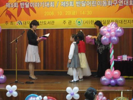 2006.10.22 10월 20일 반달이야기 대회 페이지 정보 작성자 성우보육원 댓글 0건 조회 1,817회 본문 10월20일(금요일)반달 동화구연이 안산도서관 시청각실 1층에서 있었습니다. 목록 댓글목록 댓글목록 등록된 댓글이 없습니다.