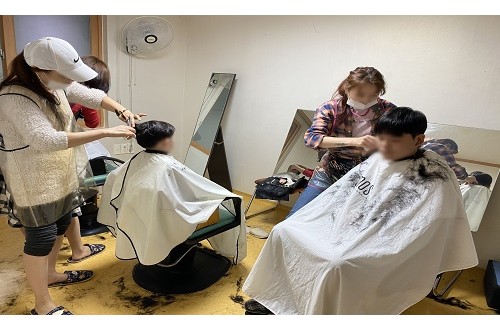 트윈스미용실에서 오셔서 미용봉사 해주셨습니다
