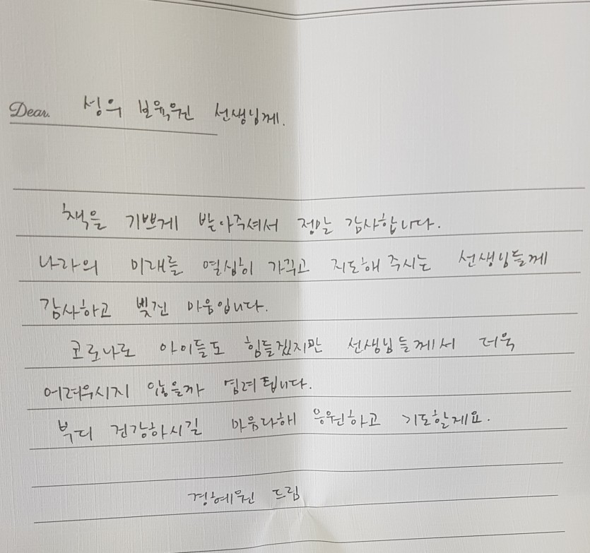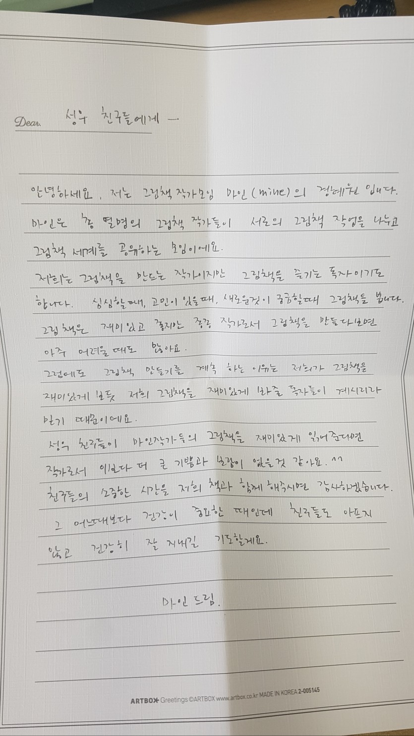 20200527 마인(mine-그림책작가모임)의 마음 따뜻한 책 선물 페이지 정보 작성자 성우보육원 댓글 0건 조회 7,184회 본문 마인(mine)이라는 그림책작가모임에서 성우아이들을 위해 마음 따뜻한 손편지와 함께 책 선물을 후원해주셨습니다.우리 아이들을 '나라의 미래'라고 표현해주시는, 작가님들의 응원을 통해 오늘도 성우아이들은 사랑을 한가득 받게 되었습니다.^^성우아이들이 즐거운 상상의 나래를 맘껏 펼칠 수 있도록 도움을 주신 마인 작가님들께 감사의 인사를 드립니다. 목록 댓글목록 댓글목록 등록된 댓글이 없습니다.