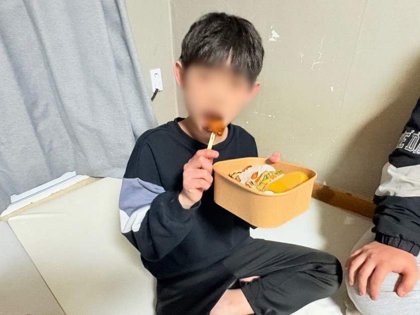 보기만 해도 군침이 도는 크로아상 샌드위치와 치킨, 상큼한 오렌지 주스와 간식까지 든든하게 구성되어 있는 도시락을 받은 아이들은