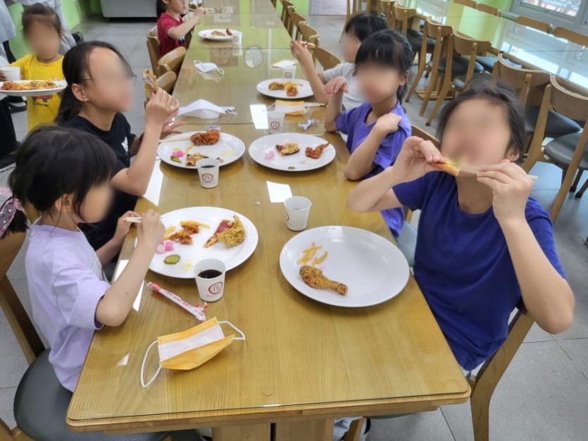 후원자분들께 감사하는 마음으로 기도를 드리고 좋아하는 피자와 치킨을 먹는 시간을 가졌는데요~
